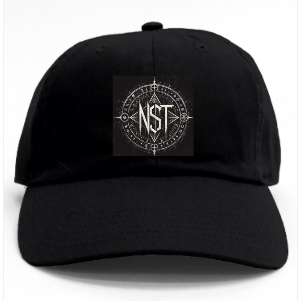 ミステリアスで重厚感のあるコンパスデザインがフロントに配置された、NST Clothingのダットハットブラックキャップ。